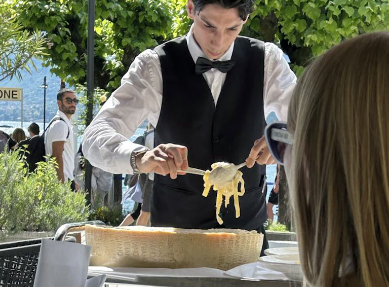 A quick ferry to Bellagio dropped us right in front of Hotel Suisse, whose outdoor restaurant is a favorite of ours. They have a huge parmesan cheese wheel they use to finish their fettuccini. Of course, three of the four of us had that for lunch along with a bottle of a Felsina I Sistri Chardonnay Collezione Privata 2019. What we found interesting about this wine is it combines Chardonnay with Sauvignon Blanc to create a lighter Chardonnay, which went very well with the thick cut pasta with creamy cheese sauce. The waiter added black truffles to make the perfect dinner.